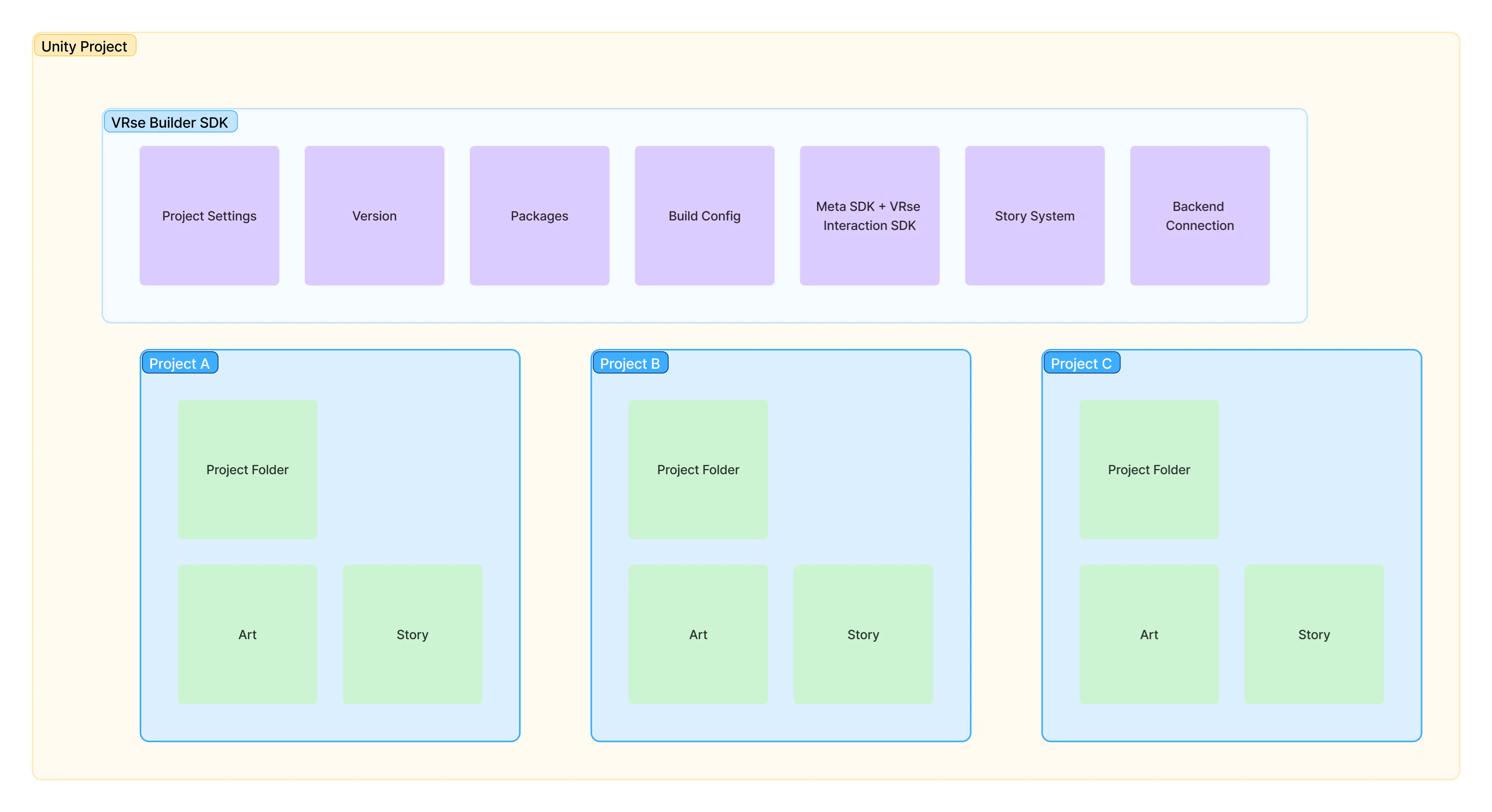 It is important to understand some important context before we take a source control decision. As explained in the Introduction document, VRse Builder is a suite of tools, the part that will require source control will be the VR content itself, that lives in Unity. To explain the Unity project, take a look at the diagram below