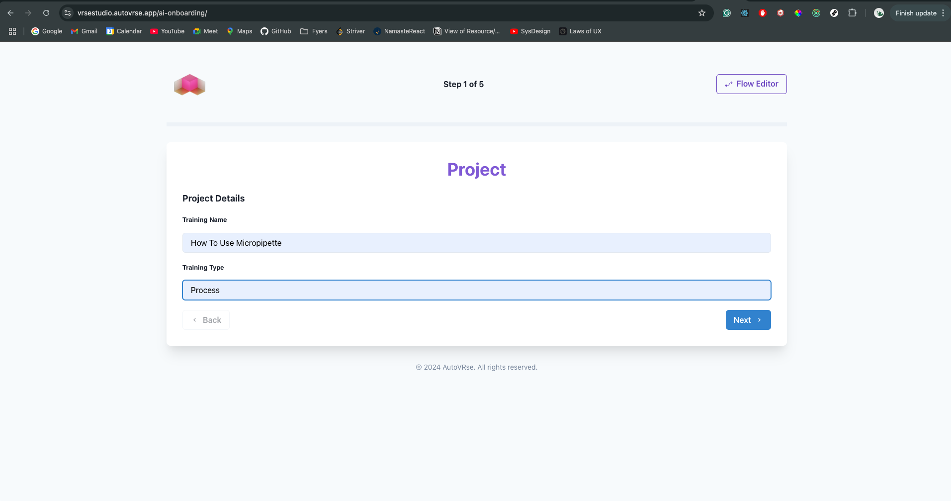 In this step, we will convert our ready perfect SOP into a story that is fit for creating VR Experiences via VRse Builder Remember you can only upload Text and Images to these bots, So convert any PDFs, Videos etc to a TEXT format. First, Enter the details in the form: Training Name - eg: Work at Height, Driving Forklifts, QA lab testing Training Type - eg: Process/Safety Traying Type of Docs Attached: SOP Training Docs Text: Paste your SOP here Upload Images: You can upload any images here (1 MB max Suggested per image) Once done press ‘Next’ and wait for the Bot to Generate the output Bot 1 will take approximately ‘4-5’ minutes to finish running Step 1 - Add fields