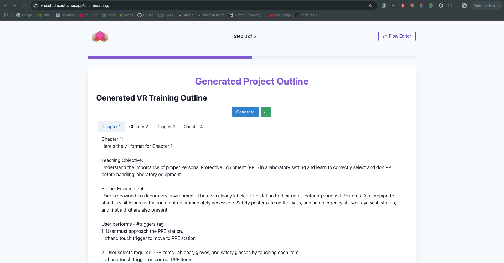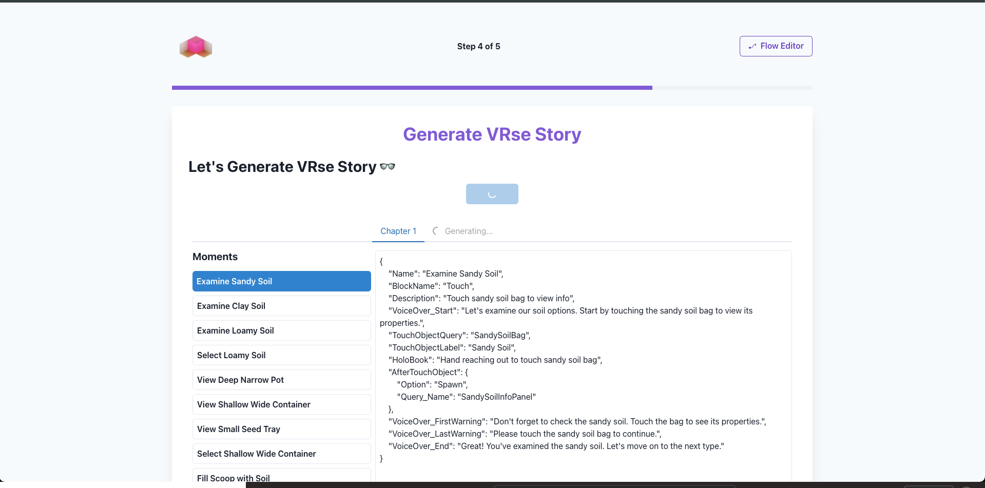 Now, we convert the V1 output to a vrse-builder readable format (JSON-like). You cannot edit this output, But if you are unhappy with the output you can always re-run the bot. Step 1 - Click on ‘Generate’ to Generate VRse Story - This is NOT editable.