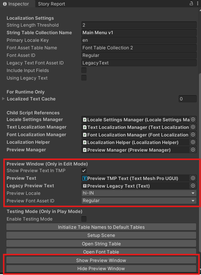 The Preview Window in the Localization Manager script allows you to verify if all the translated text and fonts are compatible. It helps detect unsupported characters in localized text and ensures the correct font asset is applied. Follow these steps:-