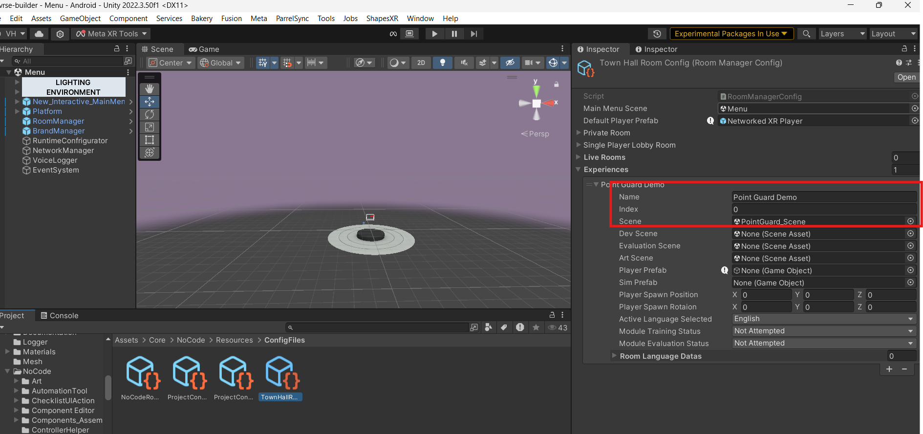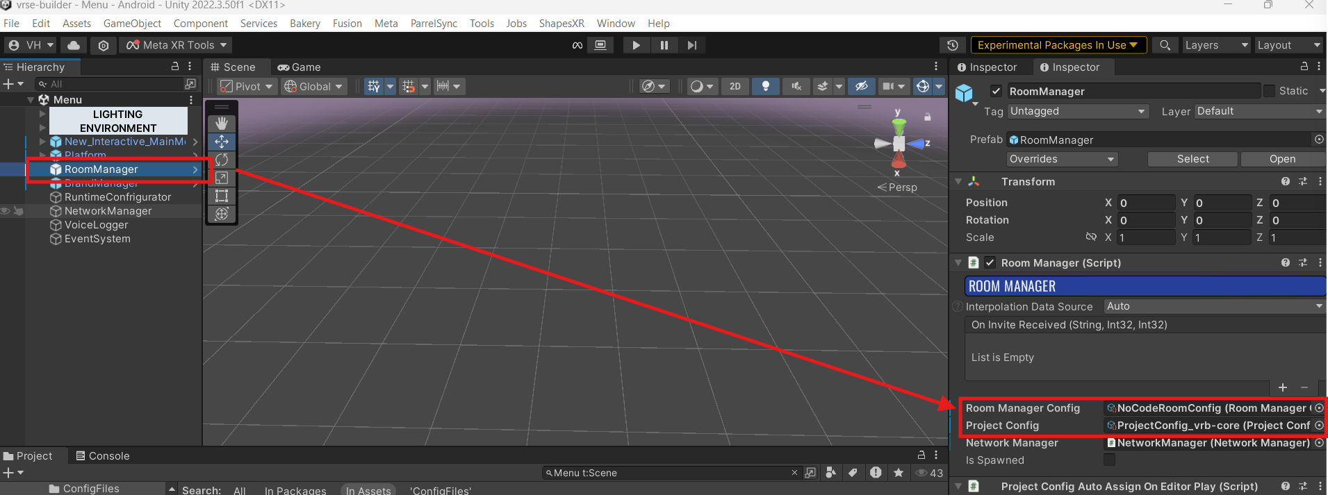 You would have created configuration files in the previous step, these need to be assigned on the Menu scene as wellFind the RoomManager gameobject on the Menu scene and the RoomManager component on it, replace the reference with your Room Manager Config and Project Config here