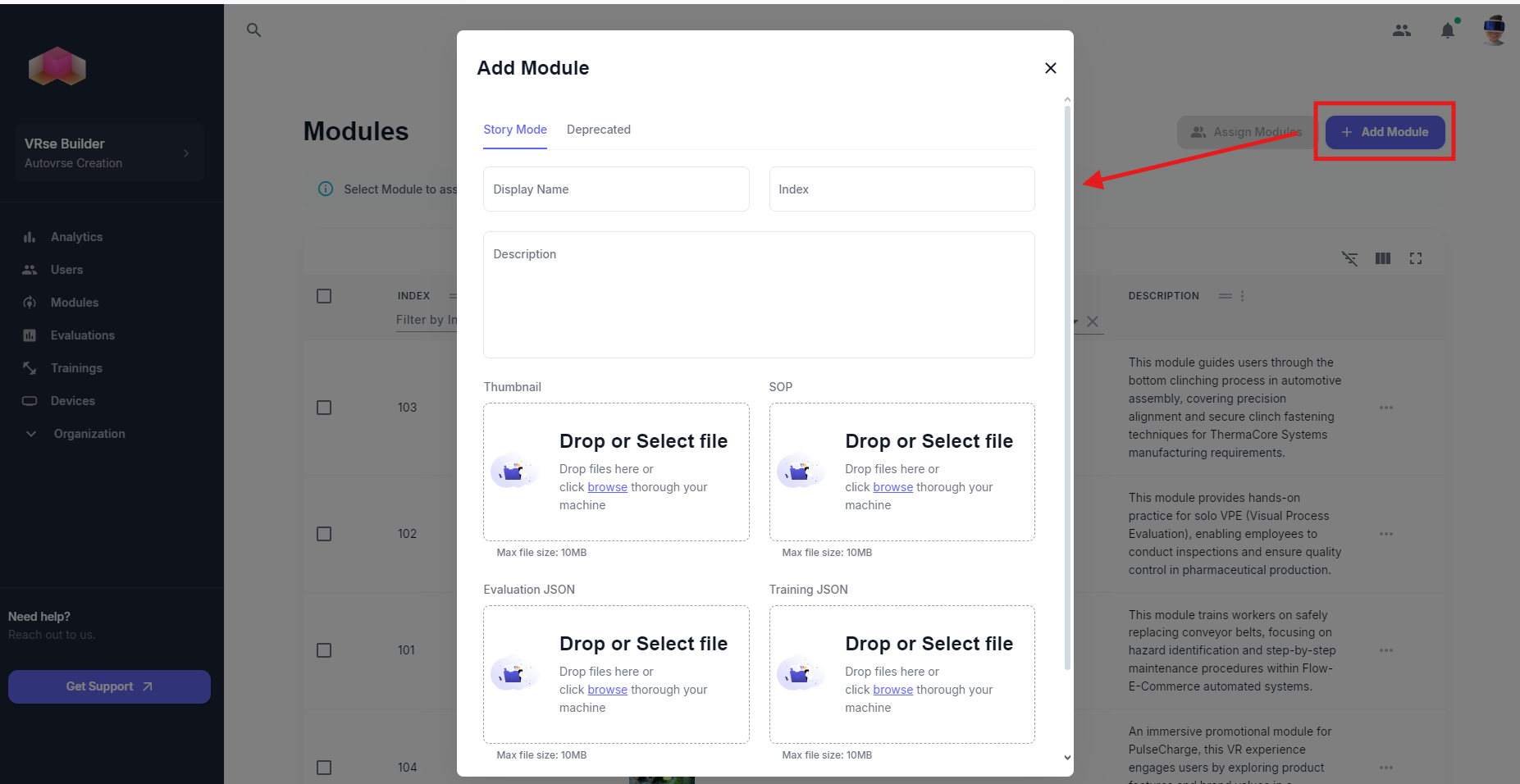 In the modules section, click on “Add Module”Give your module a name and description, upload thumbnails