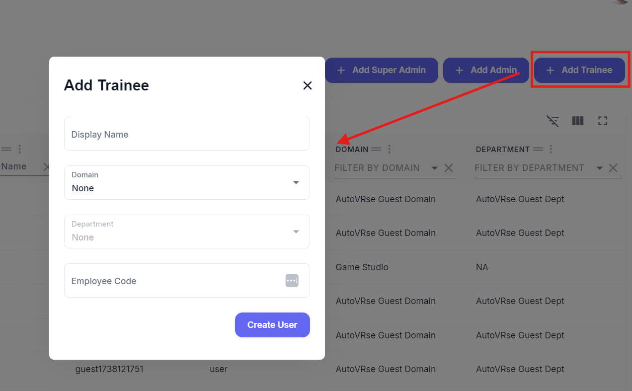 Go to the Users tab and select “Add Trainee”.Enter display name, select the domain and domain you just created, and give the trainee an employee code