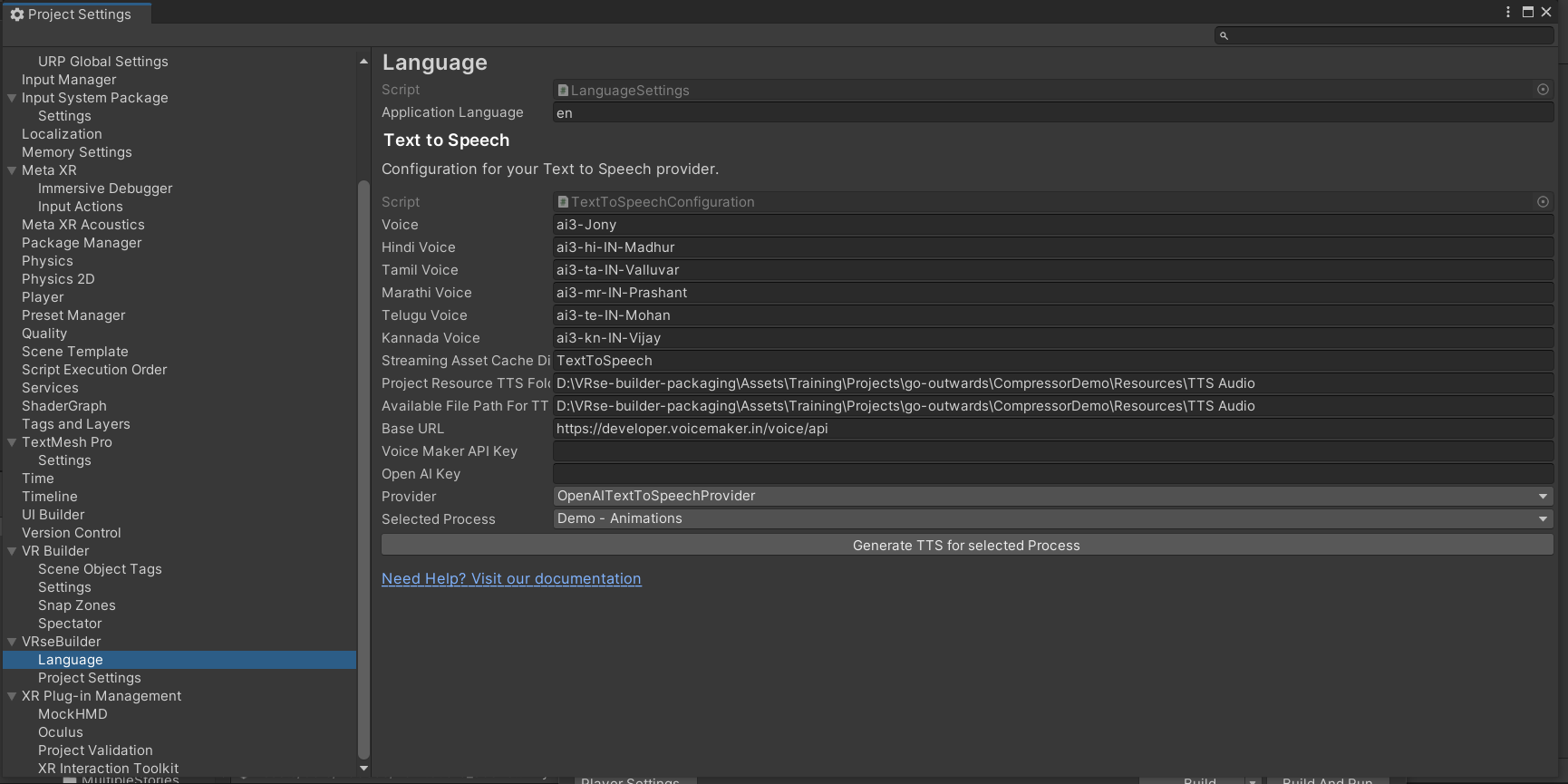 Text-To-Speech feature is present on the Unity Editor to generate voice overs for your experience, however you need to add API keys for the same in a configuration In Unity, go to Edit>Project Settings>VRseBuilder>Language The configuration here is setup such that an API from OpenAI TTS or VoiceMaker Add your key in the API Key section